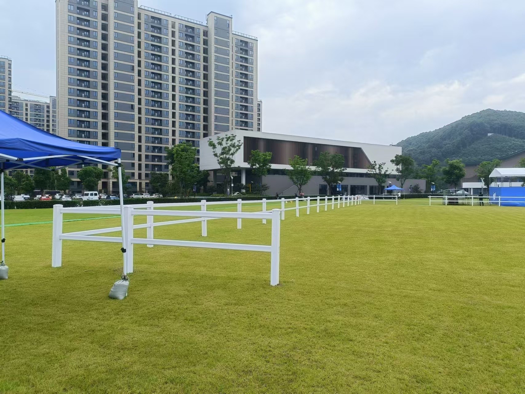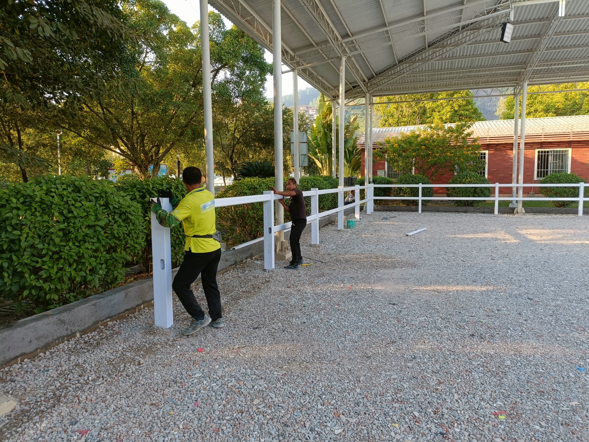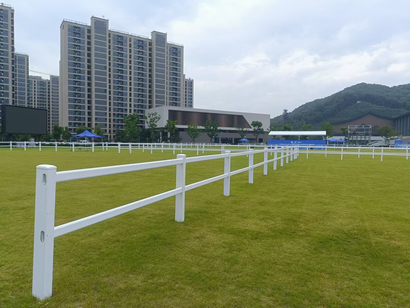 The equestrian fence stands 1300 mm (approx. 4.3 ft) tall and is available in two-rail (108+108 mm) or three-rail (108+108+108 mm) configurations. It features heavy-wall rectangular UPVC posts at a height of 1300 mm, with reinforced gate posts incorporating internal metal hinges for added durability. The top, middle, and bottom rails are all made from 108 mm UPVC planks. Fence posts are spaced every 3000 mm (approx. 10 ft), ensuring excellent stability and structural strength. This fencing system is suitable not only for equestrian arenas, but also for ranching, livestock enclosures, crowd control, sports venues, and exhibition perimeter safety.