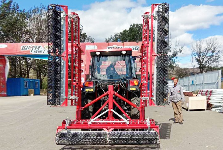When folded, the leveler measures approximately 8.2 feet wide and 9.8 feet high. Once deployed, it expands to a workingwidth of 24.6 feet and a height of 4.9 feet, offering extensive ground coverage and significantly improving operational speed.