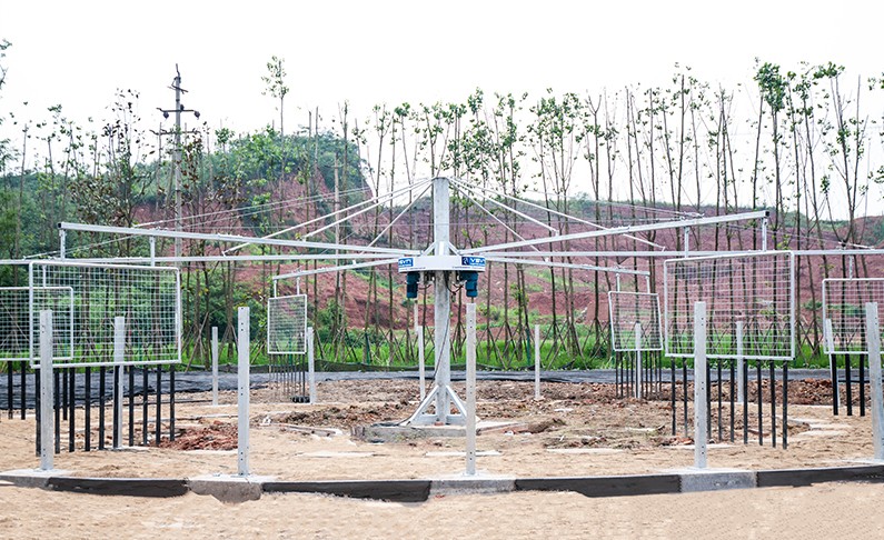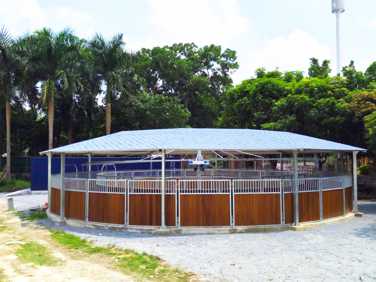 This overhead-motor horse walker has a diameter range of 30–66 ft (approx. 9–20 m) and accommodates 3–8 horses running simultaneously. It utilizes 1–2 German NORD variable-speed gear motors, with Siemens SINAMICS controller enabling automatic forward/reverse direction and stepless speed adjustment.