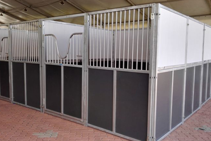 The standard composite panel horse stall features a robust steel frame structure equivalent to permanent stalls, constructed with 2" × 2" (approx. 50 × 50 mm) galvanized Q235 steel tubing, integrated with VSVN’s custom U-channel reinforcements to enhance rigidity. It is equipped with universal connectors compatible with VSVN tent systems for fast and secure installation.