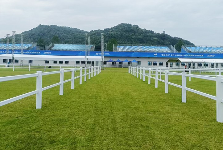 The equestrian fence stands 1300 mm (approx. 4.3 ft) tall and is available in two-rail (108+108 mm) or three-rail (108+108+108 mm) configurations. It features heavy-wall rectangular UPVC posts at a height of 1300 mm, with reinforced gate posts incorporating internal metal hinges for added durability. The top, middle, and bottom rails are all made from 108 mm UPVC planks. Fence posts are spaced every 3000 mm (approx. 10 ft), ensuring excellent stability and structural strength. This fencing system is suitable not only for equestrian arenas, but also for ranching, livestock enclosures, crowd control, sports venues, and exhibition perimeter safety.